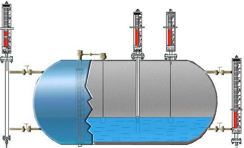 磁翻板液位計(也可稱為磁性浮子液位計)根據浮力原理和磁性耦合作用研制而成。當被測容器中的液位升降時,液位計本體管中的磁性浮子也隨之升降,浮子內的永久磁鋼通過磁耦合傳遞到磁翻柱指示器,驅動紅、白翻柱翻轉180°,當液位上升時翻柱由白色轉變為紅色,當液位下降時翻柱由紅色轉變為白色,指示器的紅白交界處為容器內部液位的實際高度,從而實現液位清晰的指示。