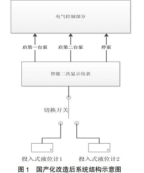 如圖1所示,國產化改造后,地面排水控制系統用防凍液液位計測量地坑液位,用智能二次儀表接收防凍液液位計的信號,并根據設定的液位報警值向電氣控制部分發出啟動和停運排水泵信號,控制系統配置了2個防凍液液位計,通過1個轉換開關,可以選擇投入使用的液位計,也可對比兩個液位計的測量數據,通過定期巡檢發現液位測量故障。