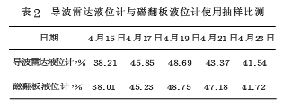 另外,2012年新建20萬t/a合成氨系統(tǒng)2000m³液氨球罐上安裝有一臺LD51纜式導波雷達液位計(位號:LT1201A)和一臺磁翻板液位計,該信號均引入DCS顯示。在開始安裝調試過程中發(fā)現(xiàn)雷達液位計與磁翻板液位計顯示不一致,經(jīng)檢查發(fā)現(xiàn)導波雷達液位計取樣管原始高度不正確,經(jīng)重新調整并對其相關參數(shù)進行設定后測量顯示一致。長期穩(wěn)定運行,給工藝控制提供了準確數(shù)據(jù),滿足了工藝要求,有效地保障了設備和人身安全。2014年4月儀表人員抽樣比測記錄數(shù)據(jù),見表2所示。