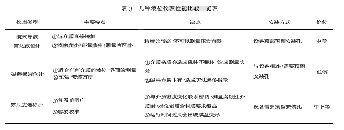 通過以上案例分析,幾種液位檢測儀表在液氨儲罐上的應用各有不同的使用效果,現(xiàn)將其性能指標歸納如下,供設計選型及儀表維護人員參考。