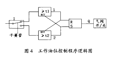 液位計(jì)筒體內(nèi)徑d/~i0mm,標(biāo)尺長(zhǎng)750mm。750mm×20%=150mm,280÷750=37.3%),液位計(jì)油位滯后于貯罐油位變化。液位計(jì)回油時(shí),浮筒漂向管口,則阻尼作用更強(qiáng)了,低油位*限開(kāi)關(guān)LB/LVL6不能及時(shí)動(dòng)作和關(guān)閉氣閥LB/EV2是造成貯油罐泄空而計(jì)算機(jī)未執(zhí)行油位故障處理程序的原因。圖3 液位計(jì)故障剖析圖3.2 液位檢測(cè)開(kāi)關(guān)和控制程序干簧管式接近開(kāi)關(guān)本身依靠磁控開(kāi)或合,易受周圍磁場(chǎng)干擾產(chǎn)生誤動(dòng)。現(xiàn)場(chǎng)液位計(jì)安裝位置一側(cè)與電纜橋架相鄰,而另一側(cè)常有行車電磁吸盤吊裝鋼卷作業(yè)。從工作油位控制邏輯過(guò)程可以看出(圖4):盡管油位檢測(cè)開(kāi)關(guān)已通,每15s(t1=t2=15s)內(nèi),只要存在一次脈沖干擾,開(kāi)氣閥電路回路將未被選通。反之亦然。因此,干簧管式接近開(kāi)關(guān)誤動(dòng)產(chǎn)生錯(cuò)誤控制,也是釀成事故的另一個(gè)原因。