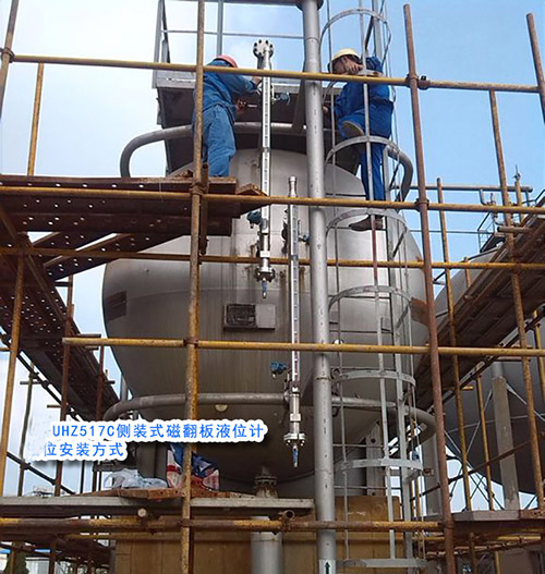 如上圖所示,如果量程為10米,分為兩段錯位安裝,下面一臺的刻度板顯示為0-5米,上面一臺液位計的翻板刻度顯示為5米至10米,下面一臺的5米與上面一臺的5米刻度應該是在同一水平面的水平線上(就是上面一臺的下端法蘭中心與下面一臺的上端法蘭中心是要在同一個水平面上)