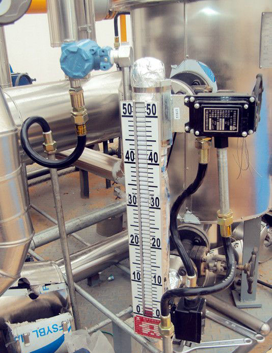 鑒于煤油儲罐液位計具有被測介質與指示機構完全隔離,密封性能好,防泄漏、適應腐蝕條件下的液位測量等優點,且可靠性高、耐振性能好、結構簡單、安裝方便、維護費用低,現已在電力、石油、化工、冶金、環保、船舶、建筑、食品等行業得到廣泛應用。本公司用戶上海某公司帶熱壓縮器低溫多效蒸餾海水淡化的濃鹽水、蒸餾水及冷凝水液位測量都采用帶遠傳的煤油儲罐液位計。為了防止結垢,需在低溫的情況下讓海水達到沸點,要求海水淡化裝置內部處于負壓狀態,正常運行時為-0.093MPa左右,此為用戶煤油儲罐液位計使用須達到的工藝要求,以下說明即為儀表在負壓狀態下發生管路漏氣的典型故障分析情況。