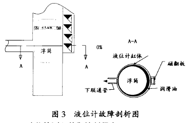 持續向空貯罐加油至液位計指示值37%時,用時約15min。反之,排油液位計回零用時大于40min。在其它區域液位變化則快許多。通過對氯酸液位計結構分析,我們發現:圓柱體浮筒(~58mm×280mm)浮在0% ~37%區間時,形同一個柱塞擋住了液位計簡體下部的聯通管管口(見圖3,