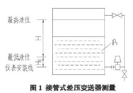 圖1中,P 1為介質密度,H。為液位起始點。差壓變送器與液體導管為水平安裝,只要確定氣相管內無冷凝液,當液位密度穩定時,即可準確測量液體的高度。但在液氨儲罐的液位測量過程中,氣相管內的氣氨會隨環境瘟度的變化而冷凝,產生壓差,故這種接管式的差壓測量方法不適用于液氮儲罐的測量。