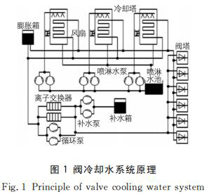 閥冷卻水系統(tǒng)主要構(gòu)成部分為閥內(nèi)冷水系統(tǒng)與閥外冷水系統(tǒng)。閥內(nèi)冷水系統(tǒng)主要通過內(nèi)冷水與閥組件直接接觸流動(dòng),將襯四氟磁翻板液位計(jì)中熱量帶出,確保襯四氟磁翻板液位計(jì)組件中晶閘管、水冷電阻、陽*電抗器等發(fā)熱元件運(yùn)行溫度具有可控性。而閥外冷水系統(tǒng)主要通過閉式冷卻塔或風(fēng)機(jī)將內(nèi)冷水中熱量帶走,并排放至環(huán)境中。襯四氟磁翻板液位計(jì)內(nèi)、外冷水系統(tǒng)的協(xié)同運(yùn)行,可以使襯四氟磁翻板液位計(jì)組件內(nèi)部冷卻持續(xù)進(jìn)行,并滿足元器件結(jié)溫要求,進(jìn)而保證系統(tǒng)整體運(yùn)行穩(wěn)定性、安全性。閥冷卻水系統(tǒng)原理如圖1所示。