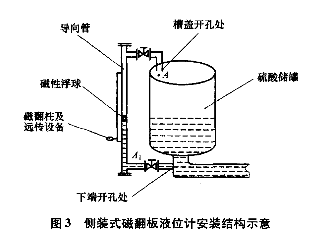 經過一年多來的運行實踐表明,這種安裝方式能準確測量槽內液位,浮子再未出現卡死的情況,沒有罐內硫酸的環流沖刷,主體管也沒有了沖刷腐蝕。經裝置大修期間拆開檢查,主體管內壁無明顯腐蝕,也沒有酸泥附在內壁,浮子也沒有任何破損和變形,不僅使用壽命延長,而且安全可靠,基本免維護。側面安裝方式的關鍵點在于:①酸槽內壁襯有瓷磚,故引流管上開孔應選擇槽蓋合適位置,下孔*好在進口管上,且均需加閥門,便于維護;②考慮管內硫酸在*端天氣時對磁翻柱及測量裝置的影響,因本公司循環槽溫度在75 ℃左右,為避免夏天溫度過高影響傳感器測量,冬天防凍,管徑D應在80mm以上可保證正常測量。