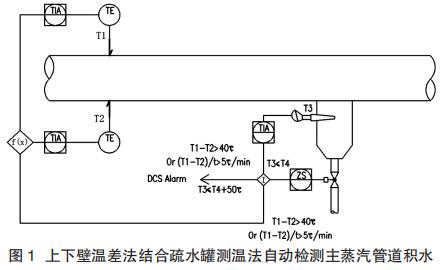 (1)主蒸汽管道積水的自動檢測與控制。推薦采用上下壁溫差法與疏水罐測溫法結合的形式,自動檢測主蒸汽管道的積水情況,不僅造價較低,還比單獨某種測量方法的可靠性要高很多,如圖 1 所示。