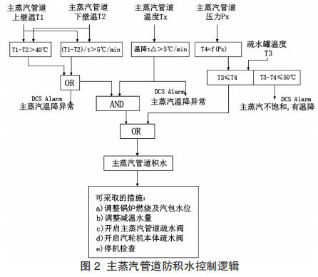 結合主蒸汽管道積水的上下壁溫差法與疏水罐測溫法結合自動檢測方法, 主蒸汽管道防積水可以采用如圖 2 所示中的控制邏輯與策略。