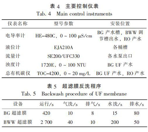 膜處理工藝應(yīng)用中, 通量下降過快是影響系統(tǒng)正常運行的主要因素。 而人工清洗需要耗費大量人力, 為此通過程序設(shè)定實現(xiàn)自動反洗。BG 和 BWW 超濾膜采用先氣洗后水洗的清洗模式, 程序設(shè)定見表 5。