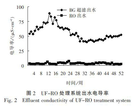 經(jīng)過 1 年的連續(xù)運行, 晶背研磨廢水進水 TOC質(zhì)量濃度為 0.5 ~ 5.0 mg / L, 濁度為 80 ~ 100 NTU,SiO2 質(zhì) 量 濃 度 為 2 ~ 4 mg / L, 反 洗 廢 水 進 水 TOC質(zhì) 量 濃 度 為 1.5 ~ 3.0 mg / L, 濁 度 為 4 ~ 8 NTU,UF-RO 處理出水 TOC 質(zhì)量濃度低于 1 mg / L, 濁度低于 0.1 mg / L, SiO2 質(zhì) 量 濃 度 低 于 1 mg / L, 完 全可以回用至超純水預(yù)處理系統(tǒng)。 UF-RO 處理系統(tǒng)出水電導(dǎo)率和 TOC 濃度見圖 2 ~ 圖 3。