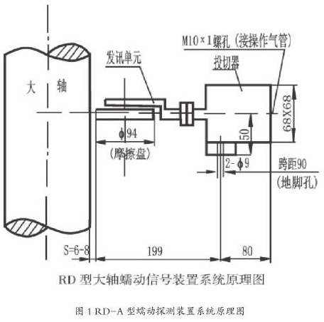 該電站蠕動探測之前主要使用的是氣動式機械蠕動裝置和電動式機械蠕動裝置,哈電機組和 VHS 機組使用的是氣動式蠕動裝置,型號為 RD-A 哈控,RD-A 型蠕動探測裝置由投切器和發訊單元兩部分組成,當機組停機完成后通過蠕動控制電磁閥(空氣電磁閥)向投切器通入壓縮空氣,它將發訊單元向前推進,使其磨擦盤與機組大軸表面相接觸(有稍許正壓力)。如果大軸發生蠕動,轉角達到 1.5° ~2°時,發訊單元便發出大軸蠕動信號,作用于報警與制動回路,投入制動閘以防蠕動現象擴延。機組起動前,先動作空氣電磁閥使投切器排氣,由于彈簧力的作用,發訊單元退回原位。離開大軸表面 6 mm~8 mm,確保裝置安全。RD-A型蠕動探測裝置系統原理如圖1所示。RD-A型探測裝置易卡澀導致探測裝置投退失敗,影響開停機成功率。東電機組使用的是電動式蠕動裝置,型號為 PXJ-1D。PXJ-1D 型蠕動探測裝置多起反饋信號拒動的事件,導致開停機流程退出,其原因為電動式蠕動裝置控制回路與位置反饋節點取自同一個行程開關,當行程開關常閉節點斷開時,電機停止轉動,而此時可能因行程過短導致常開節點尚未閉合,位置信號無法正常上送至監控系統。為了解決這一問題,目前電站 15 臺機組蠕動探測裝置已換型為非接觸式蠕動探測裝置,避免開停機過程中投入或退出蠕動失敗導致的流程退出。非接觸式蠕動探測裝置設計原理為 :
