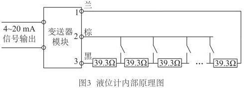 為尋求更好的改進方案,對高溫導熱油液位計的測量原理進行了深入研究。液位計測量桿中是由等間距排布的干簧管和電阻元件組成,當磁浮子達到某一高度時,對應的干簧管閉合,如果能識別出哪個干簧管閉合,即可獲得當前液位值。那么變送器又是如何識別出哪個干簧管閉合的呢?再次探究測量桿內部電路,繪制液位計內部原理圖,如圖3所示。測量桿內部電阻串聯連接,每兩個電阻的連接處連接干簧管的一端,干簧管的另一端并聯連接,*終引出蘭、棕、黑三根信號線。