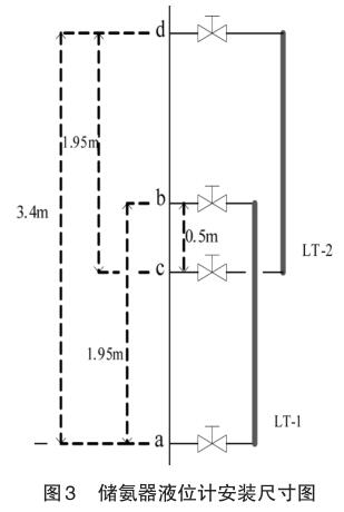 如圖 3 液位計 LT-1 的液相 a 和氣相 b 的距離為1.95m;液位計LT-2的液相c和氣相d的距離為 1.95m;LT-1 液位的氣相口 b 和 LT-2 液位的液相口 c 的距離為 0.5m;當 LT-1 實際液位到達LT-2液位的液相口c位時,LT-1液位計的信號不輸出,將由上部液位計 LT-2 來顯示工作,信號也有LT-2液位計*終輸出。
