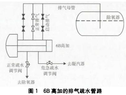 6B高壓加熱器設(shè)有2路啟動(dòng)排氣和1路正常排氣,3路排氣管道匯至1根管道進(jìn)人除氧器并插人除氧器正常液面以下,如圖1所示。啟動(dòng)階段高壓加熱器啟動(dòng)排氣閥門(mén)和正常排氣閥門(mén)均開(kāi)啟排氣,正常運(yùn)行時(shí)啟動(dòng)排氣閥關(guān)閉,正常排氣閥開(kāi)啟。排氣管線從7.5 m平臺(tái)經(jīng)過(guò)多次折向匯集到23 m排氣母管,然后再引人除氧器,這導(dǎo)致排氣管線存有蒸汽冷凝水;由于在排氣管線上存有一定的冷凝水,啟動(dòng)排氣閥開(kāi)啟后,存在于排氣管道的冷凝水依靠重力排至高壓加熱器汽側(cè),在啟動(dòng)排氣管至除氧器的管路中形成一定的真空,從而產(chǎn)生虹吸作用,使除氧器的水吸人6B高壓加熱器,導(dǎo)致B側(cè)高壓加熱器液位異常升高而發(fā)生解列。