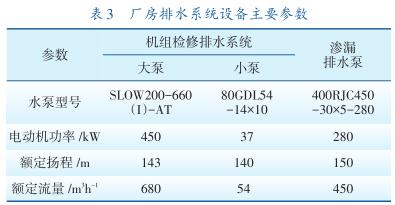 呼蓄電站廠房排水系統(tǒng)包括地下廠房滲漏排水系統(tǒng)、機(jī)組檢修排水系統(tǒng)。地下廠房滲漏排水系統(tǒng)設(shè)有1個(gè)滲漏集水井,有效容積364 m 3 ,設(shè)5臺(tái)滲漏排水泵,3運(yùn)2備,系統(tǒng)*大滲漏總排水量為2250m 3 /h。滲漏排水泵正常運(yùn)行時(shí)由廠內(nèi)滲漏排水控制盤(pán)PLC或監(jiān)控系統(tǒng)自動(dòng)控制啟停,也可就地通過(guò)每臺(tái)泵的啟動(dòng)柜手動(dòng)啟停。自動(dòng)控制時(shí)整定水位見(jiàn)表2。廠房排水系統(tǒng)設(shè)備主要參數(shù)見(jiàn)表3。