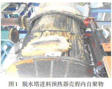 (1)脫水塔進料熱交換器和塔頂冷凝器內生成大量自聚物的主要原因是浮頭式換熱器結構復雜,設備死角多;丁二烯走殼程,流速慢,會使丁二烯在高溫環境下停留過長,發生自由基聚合反應。解決辦法是將 2 臺換熱器由浮頭式改為固定管板式換熱器,并將丁二烯含量較高的塔頂氣改為管程。一方面換熱器結構較為簡單無死角;另一方面走管程流速快,減少了丁二烯停留時間。