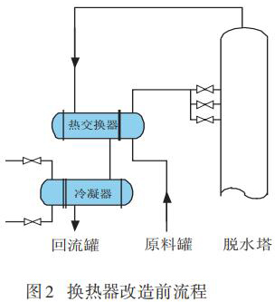冷凝器換熱面積由 367.8 m2改為 344 m2,管程塔頂氣壓力降小于 10 kPa,換熱能力與原設備相同;進料預熱器換熱面積由 260.3 m2改為 344 m2,管程塔頂氣壓力降及循環水流速均在合理范圍內,均滿足裝置操作彈性要求,換熱器改造前、后的流程分別見圖2,3。