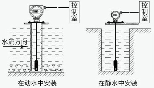 1、液位計安裝在靜止的深井、水池中時,通常把內(nèi)徑Φ45mm左右的鋼管 (不同高度打若干小孔,以便水通暢進 入管內(nèi))固定于水中,然后將投入式液位變送器放入鋼管中即可使用。