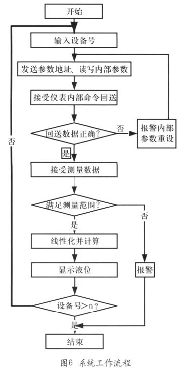 系統工作流程如圖6所示。*先對容器設備進行基本測量。輸入容器高度E,滿載高度F及應用參數A(A是用來將儀表調到滿足測量要求的應用參數)。這些參數輸入后,由智能顯示儀表或計算機得到的操作矩陣將被鎖定,以保證設置不受意外情況影響,再對采集到的數據線性化(線性化過程描述了測量電平與罐容量或產品重量間的關系)之后,測量值將在相應部分顯示出來。